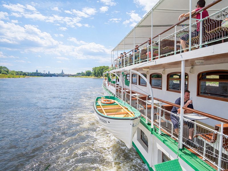 Im Anschluss genießen Sie eine Dampferfahrt vom Terrassenufer elbaufwärts bis zum Blauen Wunder und zurück. Freuen Sie sich auf beeindruckende Ausblicke auf die historische Altstadt, die Elbschlösser im Frühlingsgrün und die besondere Atmosphäre an Bord eines traditionellen Raddampfers.